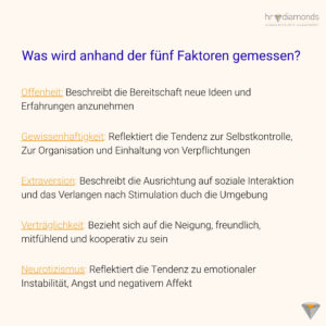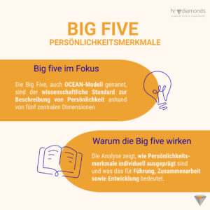 Bei hrdiamonds nutzen wir die Big Five, um Potenziale sichtbar zu machen: Wo liegen meine Stärken? Wie gehe ich mit Verantwortung, Veränderung oder Konflikten um? Und wie kann ich im Team noch besser zusammenarbeiten?